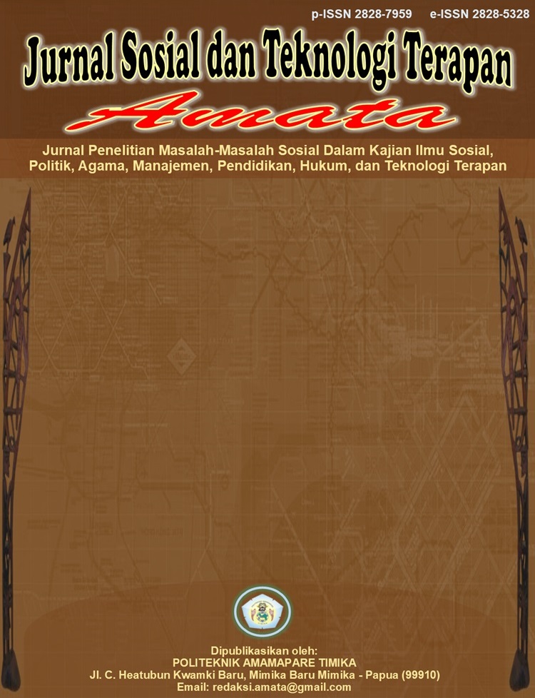 Jurnal Sosial dan Teknologi Terapan AMATA diterbitkan oleh Politeknik Amamapare Timika. Jurnal ini mempublikasikan hasil penelitian masalah-masalah sosial dalam kajian ilmu sosial, politik, religi, manajemen, pendidikan, hukum, dan teknologi terapan. Setiap naskah yang masuk akan dilakukan peer review (blind review) oleh 2 (dua) reviewer. Semua karya ilmiah yang dipublikasi di Jurnal Sosial dan Teknologi Terapan AMATA telah lolos dari pengujian Plagiarisme melalui aplikasi iThenticate. Nilai kemiripan teks karya ilmiah yang diizinkan tidak melebihi 25%.